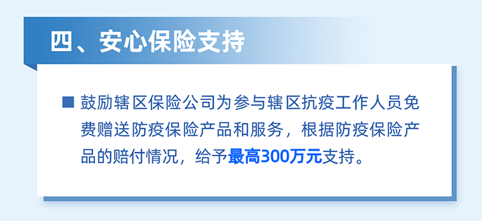 實施防疫保險補貼。對2022年3月1日至5月31日期間,購買防疫保險產品和服務的企業,按照實付保費的50%予以支持,單家企業最高5萬元。(牽頭單位:區金融工作局)
