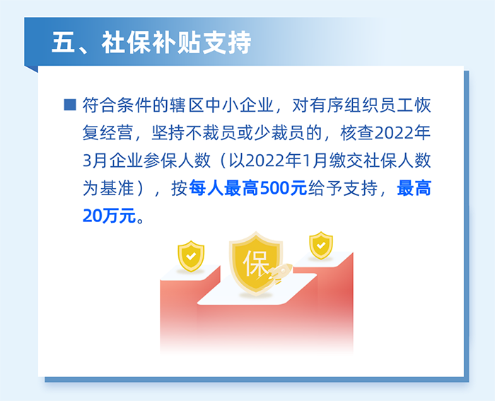 5.對南山區企業在深圳居住的員工,居住地自2022年2月1日至3月31日期間,因疫情防控被劃定為封控區、管控區(含參照管控區管理區)而影響正常工作的,根據企業實際受影響的員工人數給予企業一次性社保補貼。按企業為受影響員工上月實際繳納社會保險費的30%且每人不超過600元,給予每家企業最高不超過10萬元的社保補貼。(責任單位:區人力資源局)