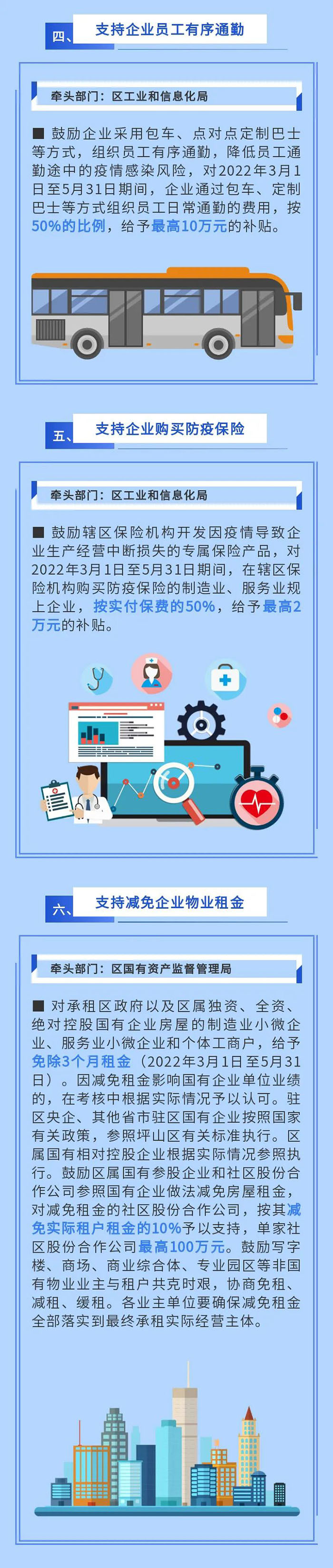 鼓勵倡導其他市場主體參照減免物業租金。對2022年3月1日至5月31日期間實際減免租金60萬元以上的社區股份合作公司(按歸屬社區股份合作公司的租金計算),及經營管理工業園區、寫字樓、商場等物業的企業,按其減免實際租戶租金的20%予以支持,單家企業最高200萬元。(牽頭單位:區投資推廣和企業服務中心)